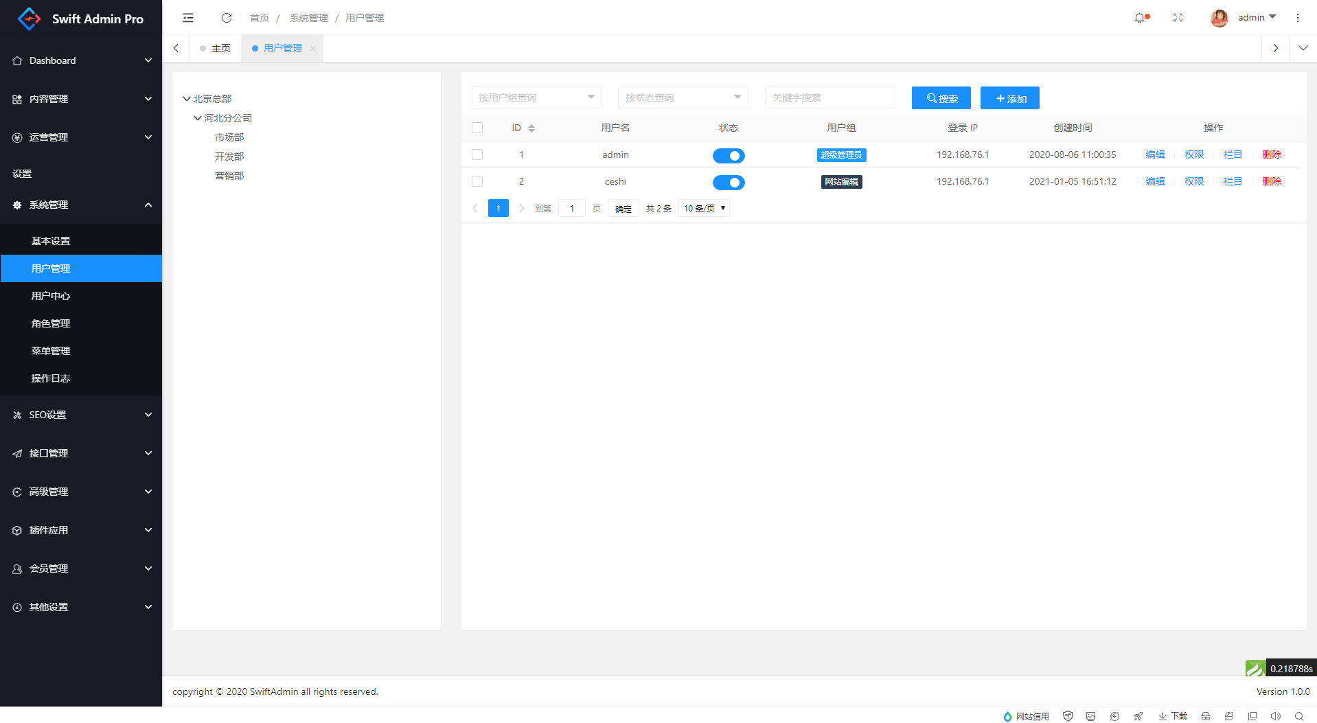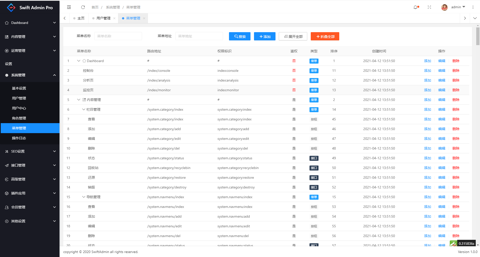 SwiftAdmin框架主张简单就是高效的原则,在设计和运维上采用最精简最高效的做法去完成业务系统的需求,并且基于ant Design的设计原则,是一款优秀的前后台极速开发解决方案。相信你第一眼就有立刻想体验SwiftAdmin框架的冲动和热情!